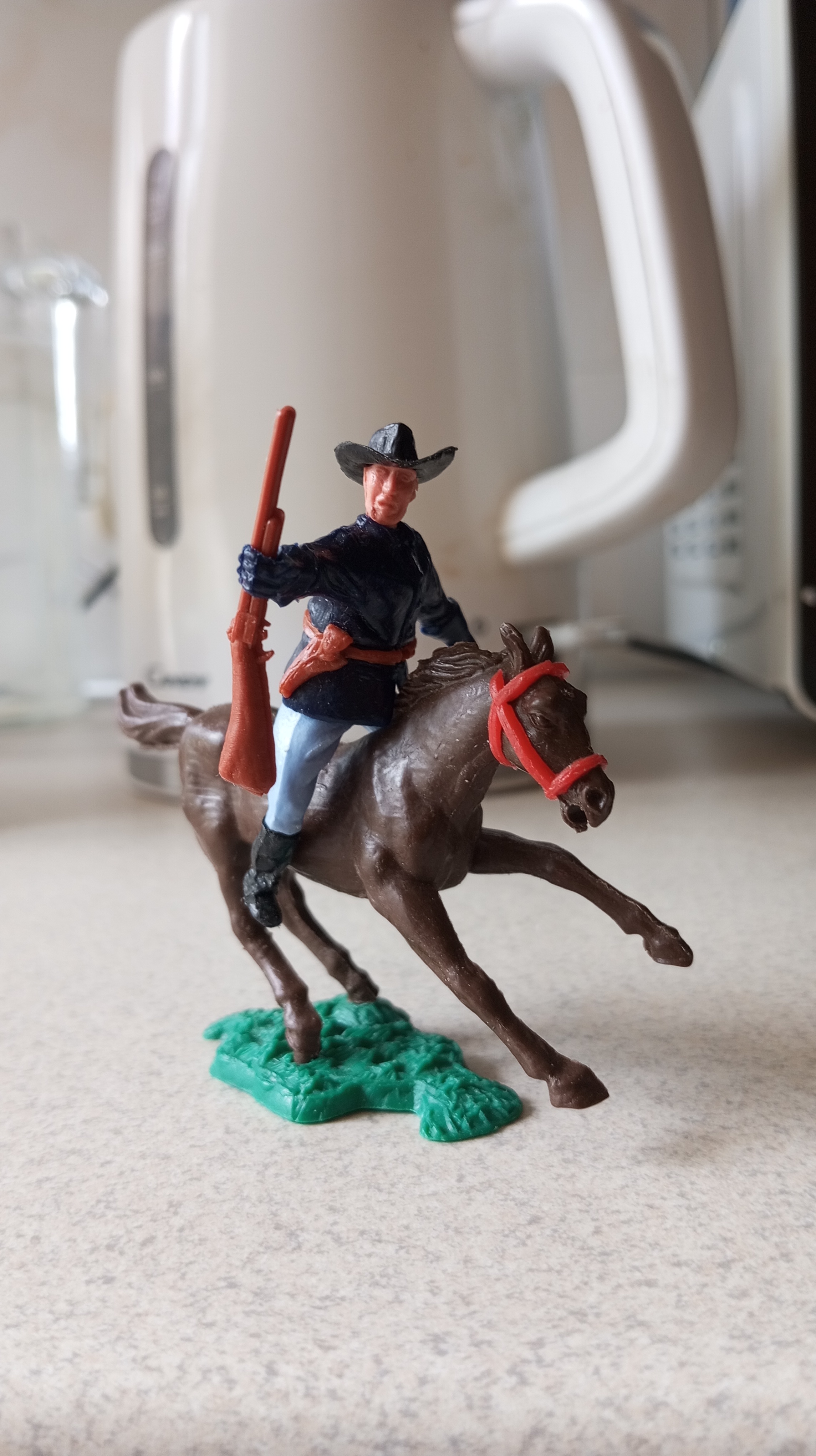 Продавец сказал - конфедерат. Я у него часто солдатиков покупаю. Как-то купил несколько от Elastolin по "Всаднику без головы". Кроме того, у товарища по группе по солдатикам тоже есть конфедерат от Timpo, только пеший.