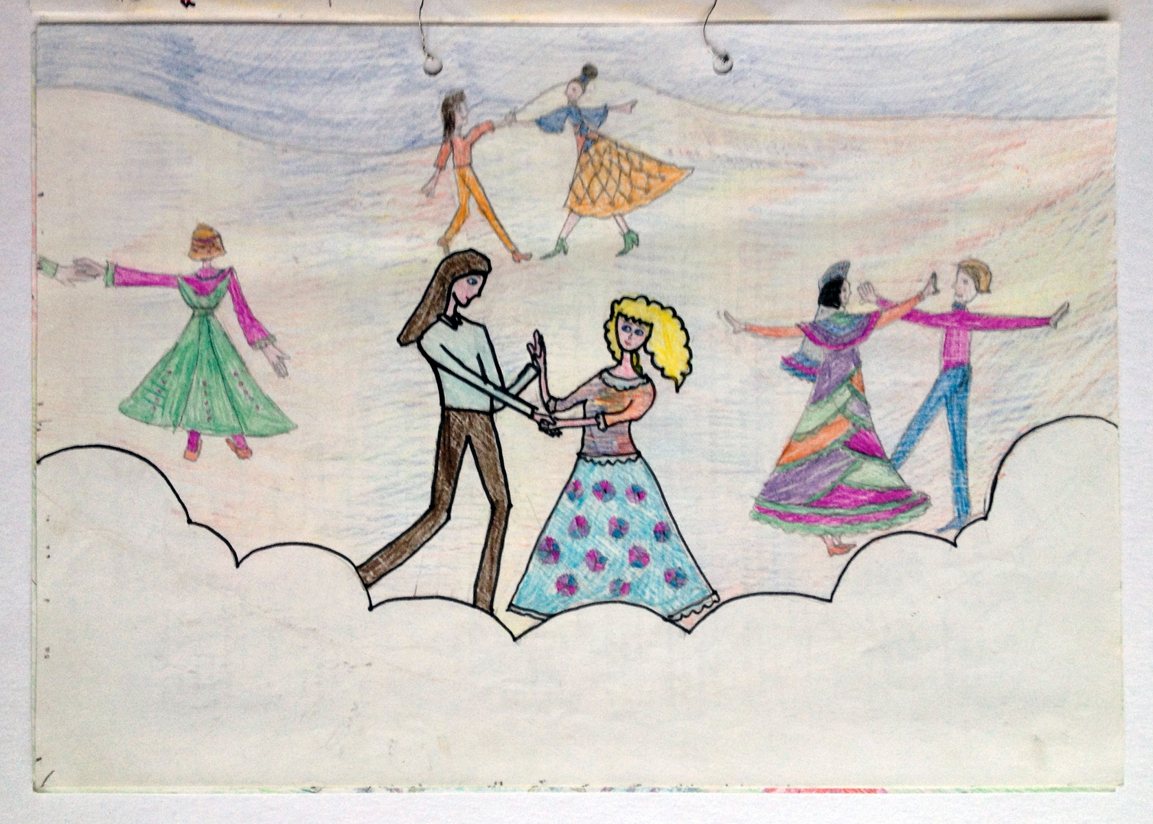 Кроме того. Мне настоятельно вспоминается, что таких рисунков было больше одного. Точно два, а быть может, три. Чтобы нарисовать такие классные ровные облака, которые мне нравились, и сделать рисунки принадлежащими как бы к одной серии, я обводила эти облака, кладя новый лист сверху на уже готовую картину. Предполагаю, что второй танец был с Энтони, а третий (если он был) - с Альбертом. Но в итоге эти рисунки не сохранились. Почему - не знаю. Есть смутное впечатление, что я решила, что делать рисунки под копирку - недостойно, и избавилась ото всех, кроме оригинала. Не знаю.