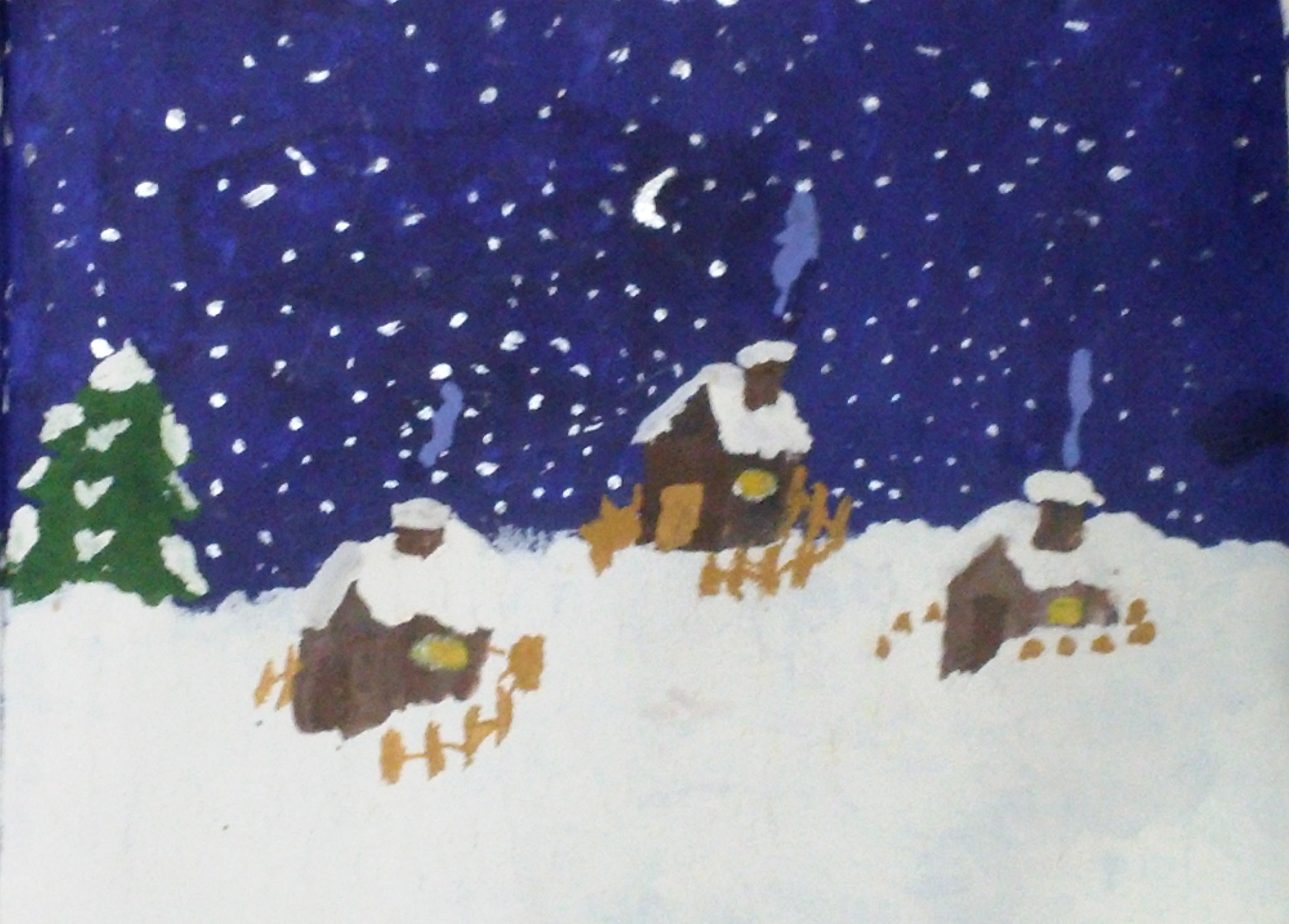 Впервые рисовала гуашью. На самом деле этот рисунок более симпатичный, чем на фотке, т.к. звезды и месяц я нарисовала серебристым блестящим акрилом, а тут этого не видно(((