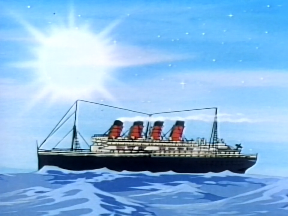 Вообще трансатлантических лайнеров с 4 трубами было не так много. Я считаю, что это был "Олимпик". Очевидно, это не мог быть "Титаник" (иначе сериал бы тут же и закончился). А "Британник" был покрашен в другие цвета.